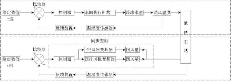 組合式空調機組送風口、回風口、新風口均設溫度傳感器T送,T回,T新,其中T送信號反饋給空調機組的比例積分調節閥,T回反饋給空調機組的電動機變頻器,空調機組的調節閥和變頻器同時調節,實現水系統和風系統聯動控制,最大程度降低地車車站的空調運行能耗。